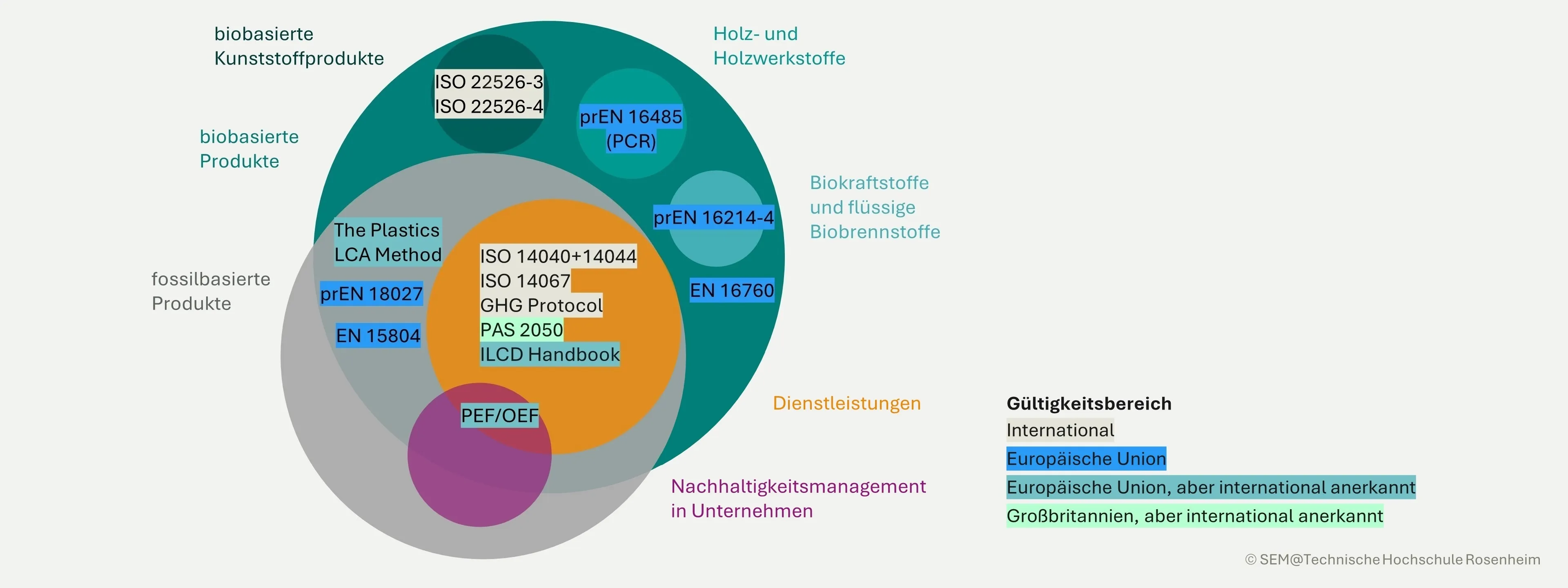 Für eine Ökobilanzierung im Kontext der Bioökonomie sind mehrere Normen und Standards verfügbar. Das Venn-Diagramm kategorisiert die LCA-relevanten Normen und Standards hinsichtlich ihrer Anwendungsbereiche, stellt Überschneidungen dieser heraus und zeigt ihre Geltungsbereiche auf.