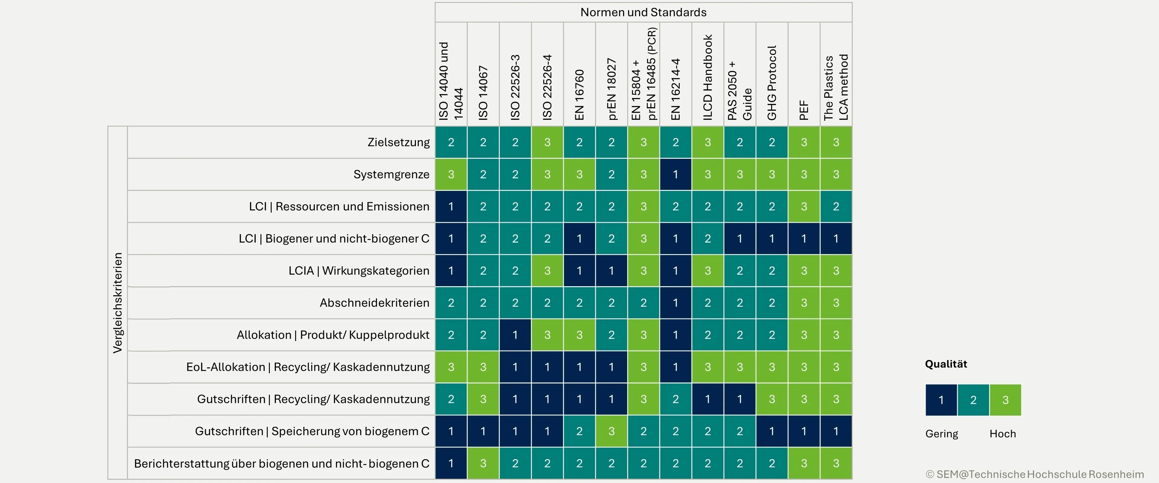 The quality combines the aspects of transparency in the procedure and guidance for carrying out the life cycle assessment and is divided into three levels. Quality level 1 represents the lowest requirements, while level 3 reflects the highest requirements for transparency and guidance. A higher quality level thus indicates that the norms and standards both set high requirements for transparency within the documentation of the LCA and offer comparatively better guidance for carrying out the LCA. It is possible, for example, that particularly high transparency requirements outweigh undetailed instructions (and vice versa) in the assessment. However, this imprecision in the qualitative assessment does not detract from the overall benefit of the classification of the norms and standards.