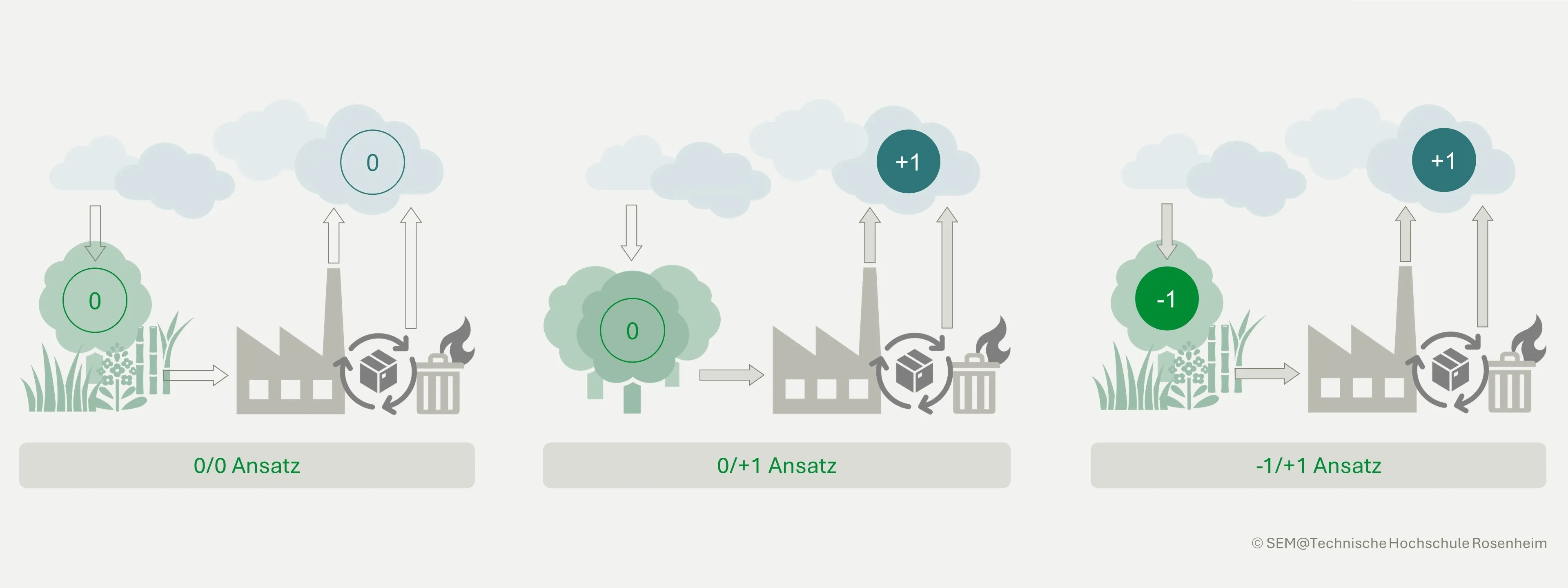 Different approaches are defined in the norms and standards, particularly for the assessment of biogenic carbon (C). The 0/0 approach, 0/+1 approach or the -1/+1 approach are used to describe whether biogenic C is taken into account in the LCA. With the 0/0 approach, biogenic C is not taken into account. The 0/+1 approach is used for non-renewable biomass, such as wood from rainforests. Due to the long growth phases, the uptake of biogenic C into the biomass is not taken into account (0), but the input of additional C into the atmosphere, e.g. during combustion, is assessed (+1). In the 1/+1 approach, both the uptake and storage of biogenic C (-1) and the release or emission into the atmosphere (+1) are taken into account and assessed.