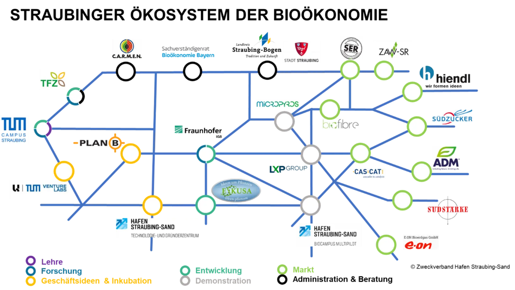 Der Hafen Straubing-Sand bietet als Wirtschaftsstandort mit dem 12 ha großen BioCampus attraktive Flächen für weitere Ansiedlungen aus der industriellen Bioökonomie. Die Lage an der Donau bietet zudem eine optimale logistische Anbindung über Straße, Bahn und Binnenschiff. Als Universitätsstandort (seit 2017 Standort der Technischen Universität München) legt Straubing einen Schwerpunkt auf die Nutzung nachwachsender Rohstoffe, Nachhaltigkeit und industrielle Biotechnologie - dazu wurden 2016 Grundsatzbeschlüsse in Stadtrat und Kreistag verabschiedet, die dieses Profil auch in politische, wirtschaftliche und verwaltungsseitige Aktivitäten einbeziehen. Das strategische Dach für die Aktivitäten in Straubing bildet die 2020 verabschiedete Bayerische Bioökonomiestrategie.