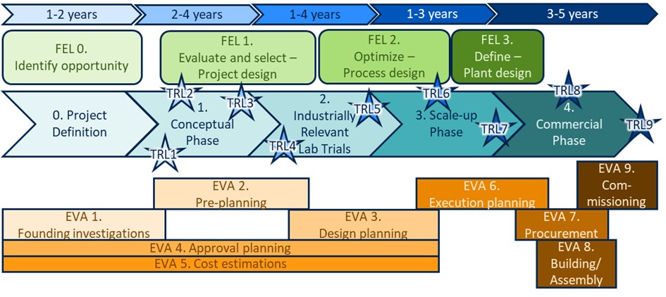 Der Entwicklungs- und Kommerzialisierungsprozess eines Bioprozesses ist in dieser Roadmap in fünf Phasen unterteilt. Darüber hinaus wird dargestellt, zu welchem Zeitpunkt die jeweiligen FEL-Stufen (Front-End Loading) anzuwenden sind und welche Technology Readiness Levels (TRLs) in den einzelnen Phasen erreicht werden sollen.